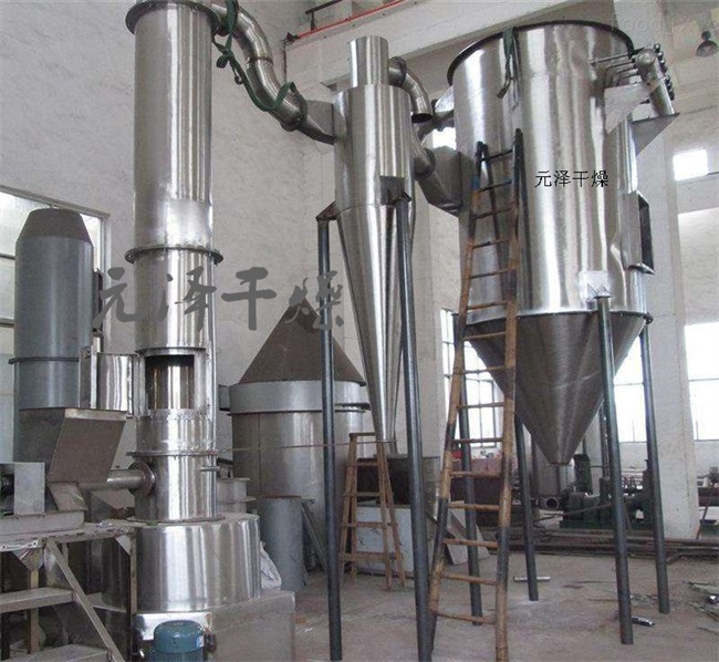 旋風式閃蒸干燥機屬對流干燥的一種,熱風從干燥塔的底部吹入,物料進入干燥塔經破碎后被熱風吹起并呈懸浮態上升,懸浮狀的物料與熱風充分接觸,瞬間完成干燥過程(一般15秒以內),干燥塔上部裝有分級器,顆粒較大或未充分干燥的物料被分級器擋住,沿塔壁回落,重新參加干燥過程。顆粒較小并充分干燥的物料由塔頂排出,再經后面的分離機構分離后,成為成品。